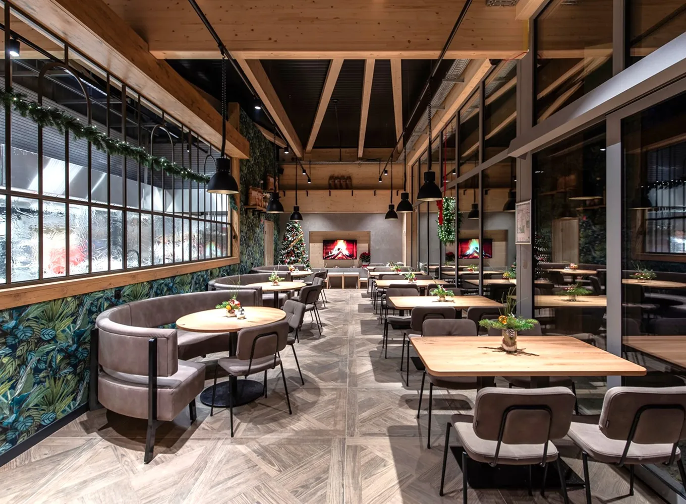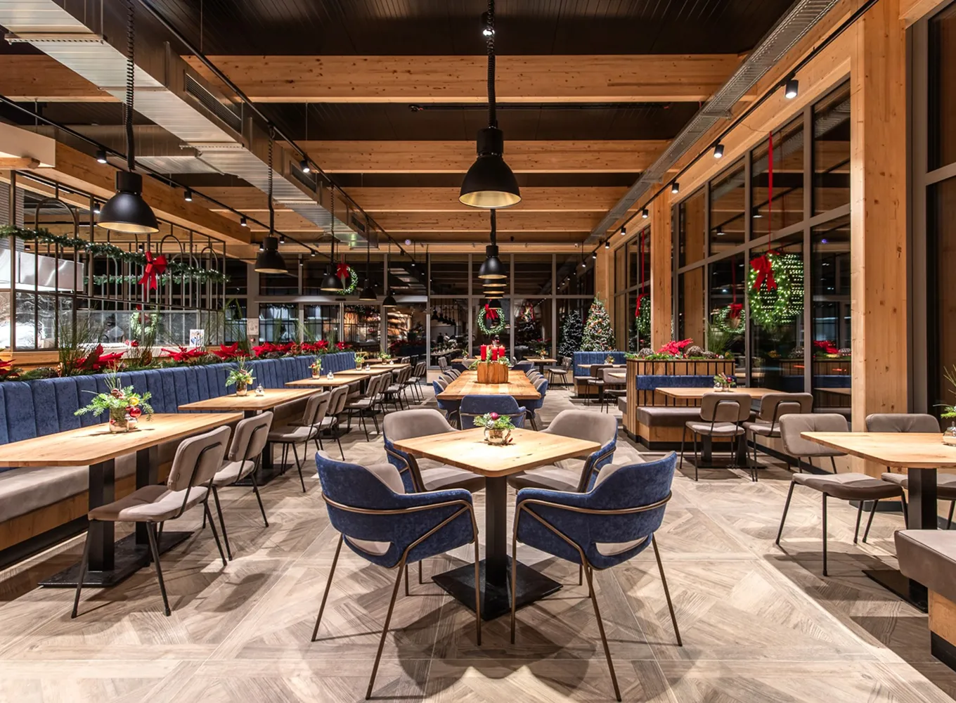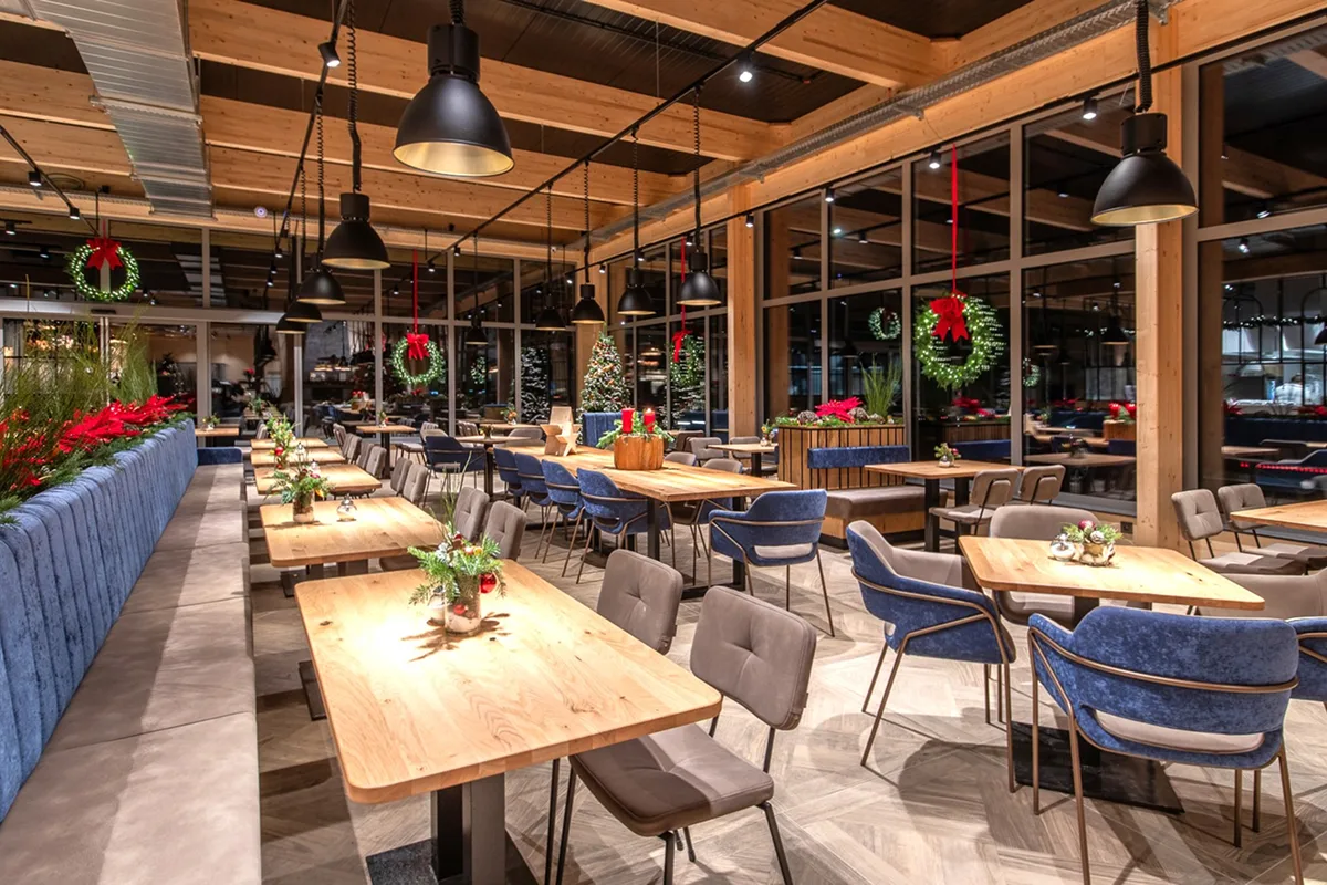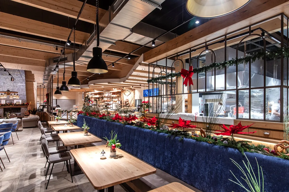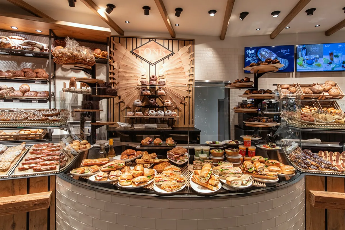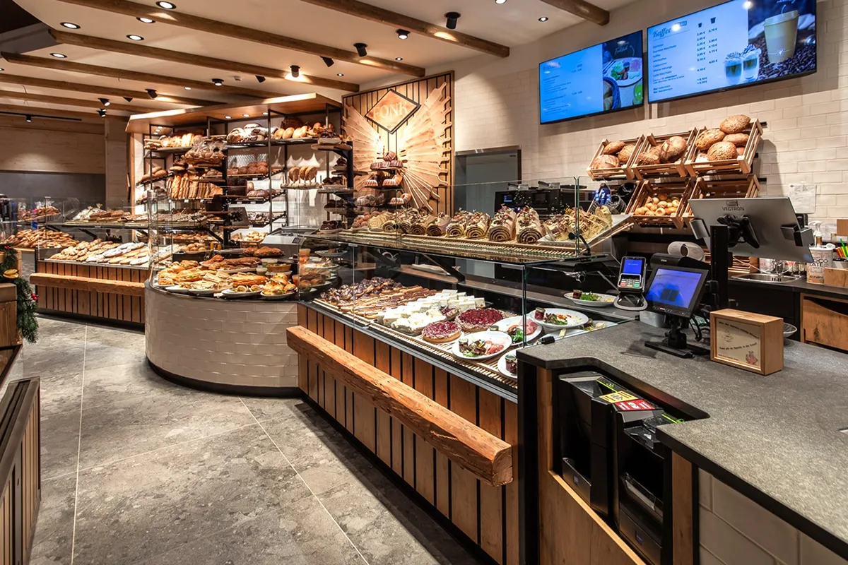 Zum Genuss des umfangreichen Bäckereisortiemntes sowie wechselndem Tagesangebot mit Frühstücksspezialitäten, Mittagsgerichten und frischen Snacks lädt ein stimmungsvoll gestalteter Cafébereich mit rund 120 Sitzplätzen ein, der in drei Zonen gegliedert ist: ein großzügiges Mittelschiff, gemütliche Nischen mit Blick in die verglaste Zubereitung/Backstube zur Stärkung der Verbindung zum Handwerk sowie ein Kaminraum mit Wohnzimmeratmosphäre – besonders in der dunklen Jahreszeit ein beliebter Ort zum entspannten Aufenthalt.