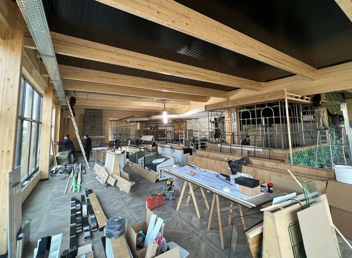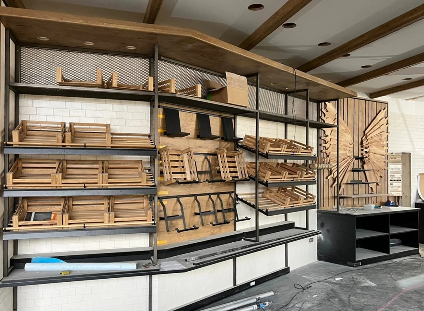 Erst im September startete der Holzständerbau des neuen Standortes mit der Fläche des Verkaufsraums, sozusagen auf der grünen Wiese.Parallel zum Bau der Außenhülle wurden alle Materialien für den Innenausbau – einschließlich raumbildender Elemente und Raumtrenner in verschiedenen Materialien - sowie Einrichtung und Interieur definiert, konzipiert und mit den eigenen Gewerken aus Schreinerei, Glaserei und Schlosserei umgesetzt.