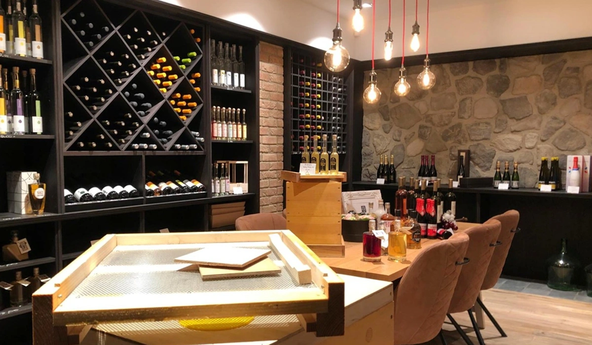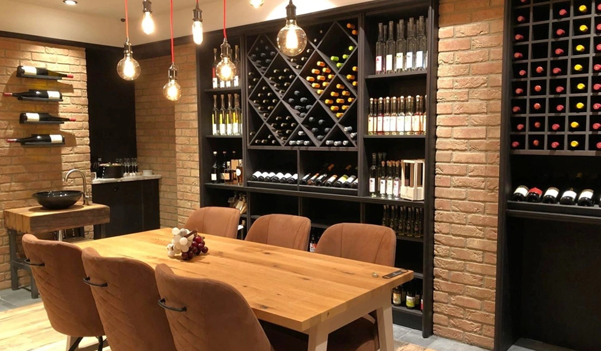 In der Weinabteilung mit integriertem Verkostungsraum wird diese Gestaltung konsequent weitergeführt. Durch ein gezielt eingesetztes Lichtkonzept entsteht hier jedoch eine deutlich wärmere und behaglichere Atmosphäre – fast so, als befände man sich direkt bei einem Winzer vor Ort.