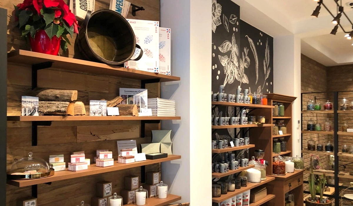 Die Sortimente verteilen sich auf unterschiedliche Ladenbereiche und Präsentationseinheiten, die durch ein stimmiges Materialkonzept aus Holz- und Steindekoren geprägt sind. Dieses verleiht dem Gesamtauftritt eine authentische und zugleich moderne Ausstrahlung.