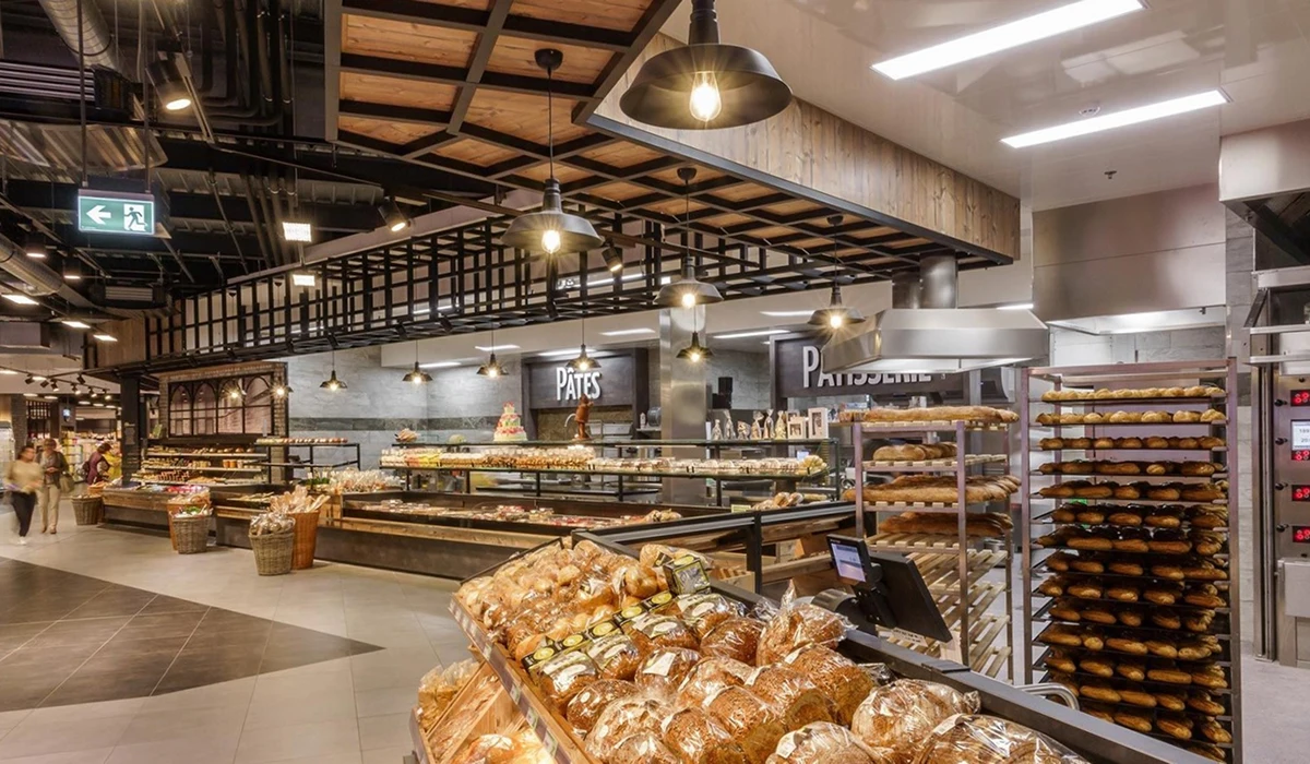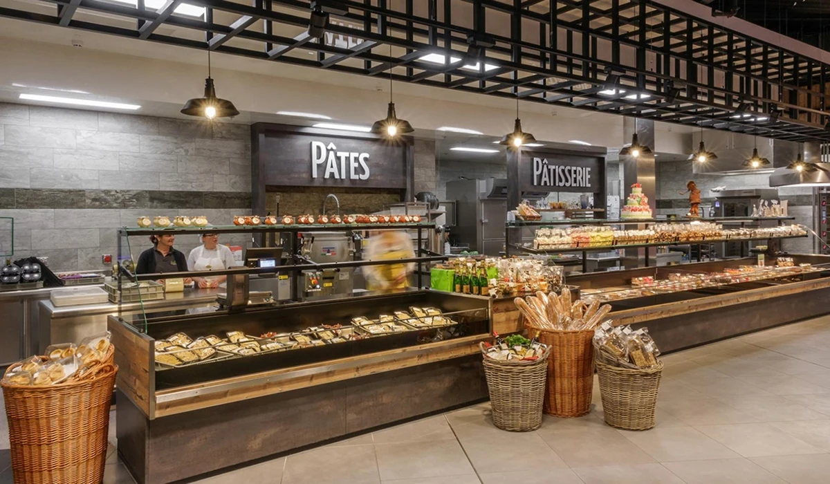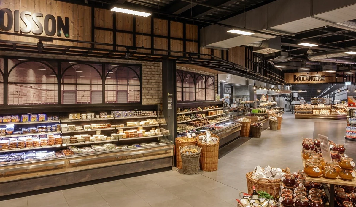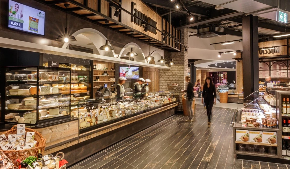 Herzstück im Markt sind moderne Frischetheken in Bedienung, ergänzt durch integrierte Selbstbedienungszonen. Die verschiedenen Abteilungen – Pâtisserie, Boulangerie, Fromagerie sowie Poisson (Fisch) – wurden funktional und gestalterisch optimal miteinander verknüpft, um ein durchgängiges Einkaufserlebnis zu schaffen.