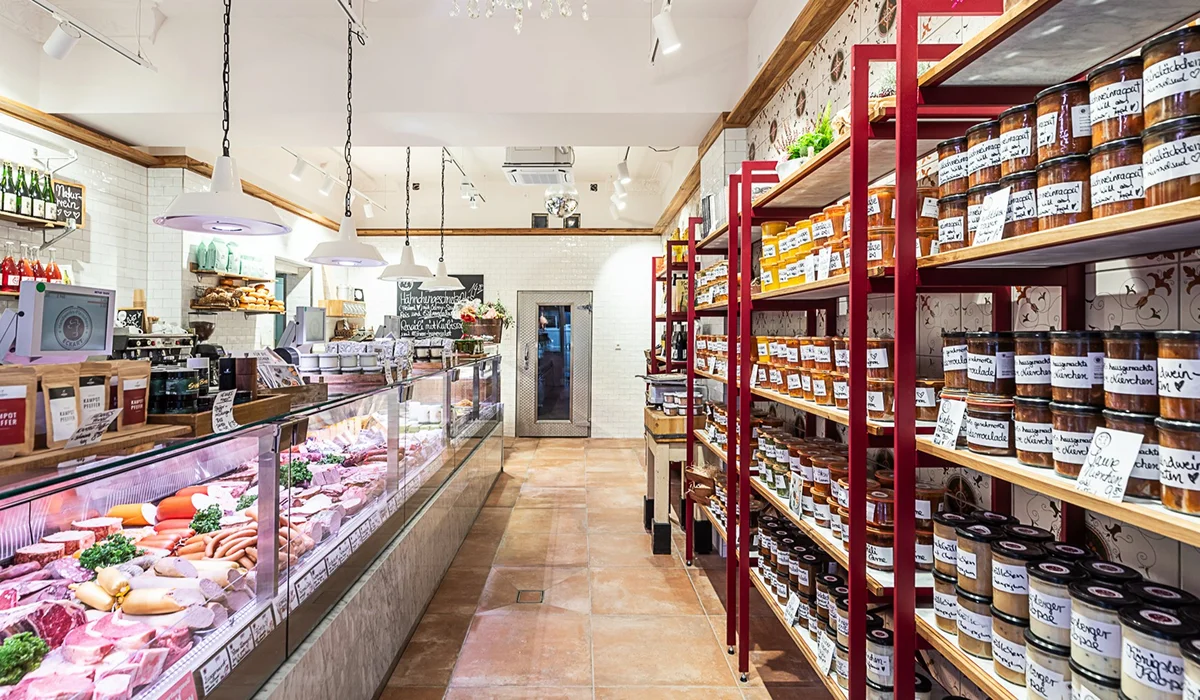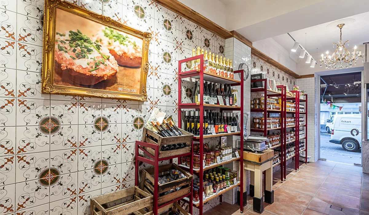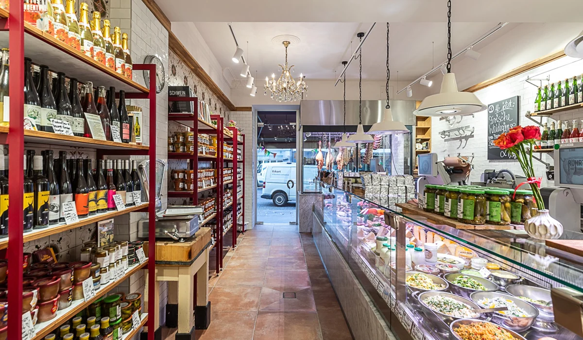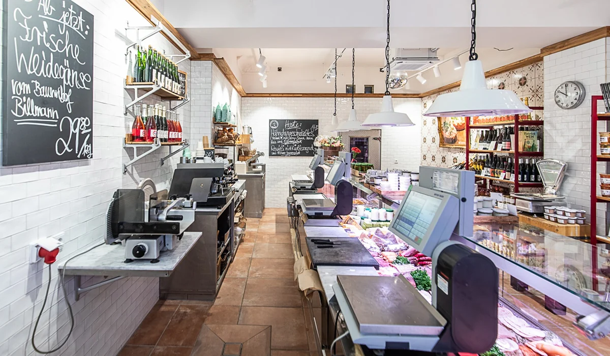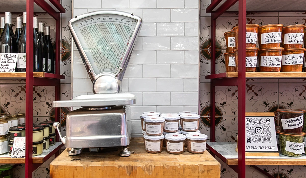 Der Fokus auf das Handwerk gibt auch den Stil der Gestaltung des Ladenkonzeptes vor. Details wie nostalgische Wandkacheln, Kronleucher, eine alte Waage und der Metzgerblock in Kombination mit Manufaktur-Regalen bieten authentische und familiäre Wohlfülatmosphäre.