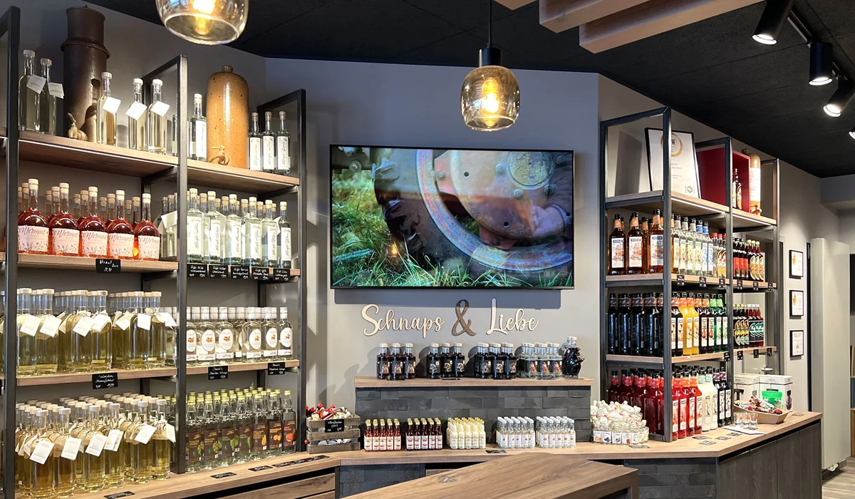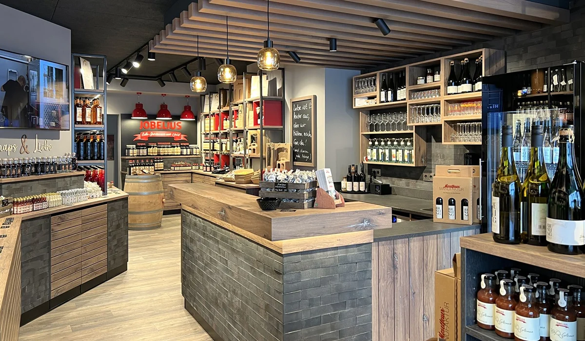 Warme Holzelemente an Decke, Wänden und Boden bestimmen die Raumatmosphäre. Korrespondierede Regal- und Warenpräsentationsmodule in Holz- und Steinoptik unterstreichen den Manufakturcharakter und laden zum Kennenlernen der Region ein.